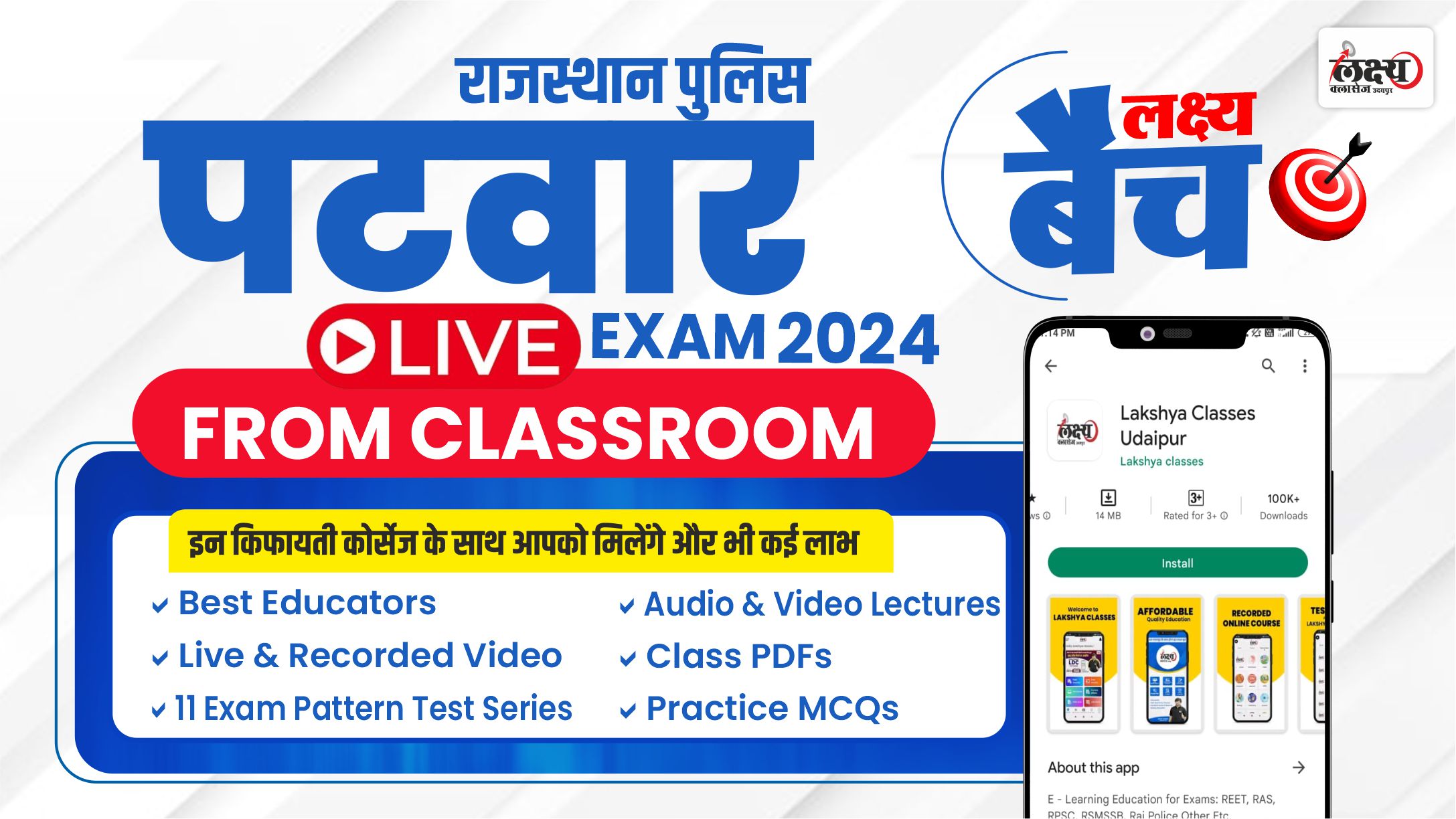 उदयपुर का सर्वश्रेष्ठ शिक्षण संस्थान लक्ष्य क्लासेज उदयपुर लाया है अपने अनुभवी एक्सपर्ट शिक्षकों के नेतृत्व में Patwar हेतु विशेष बैचेस इन कक्षाओं का आयोजन से किया जा रहा है एवं परीक्षा होने तक इन कक्षाओं का नियमित रूप से आयोजन किया जाता रहेगा।। इन बैचेस के माध्यम से आपको मिलेगा -